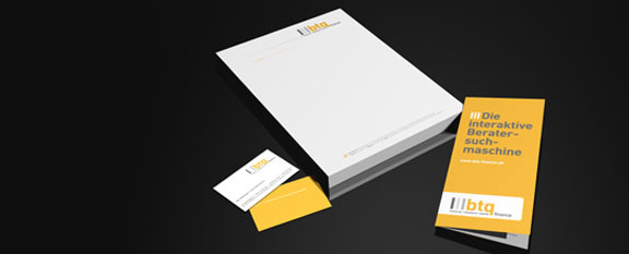 Digital-cube entwarf sowohl Logo, Geschäftspapier und Visitenkarten, als auch einen Folder für die Akquise von Beratern für die Plattform. Hierbei standen die drei Säulen von btq-finance – Beratung, Transparenz, Qualität – , die zugleich den Namen der Firma ergeben, im Fokus der Kreation.